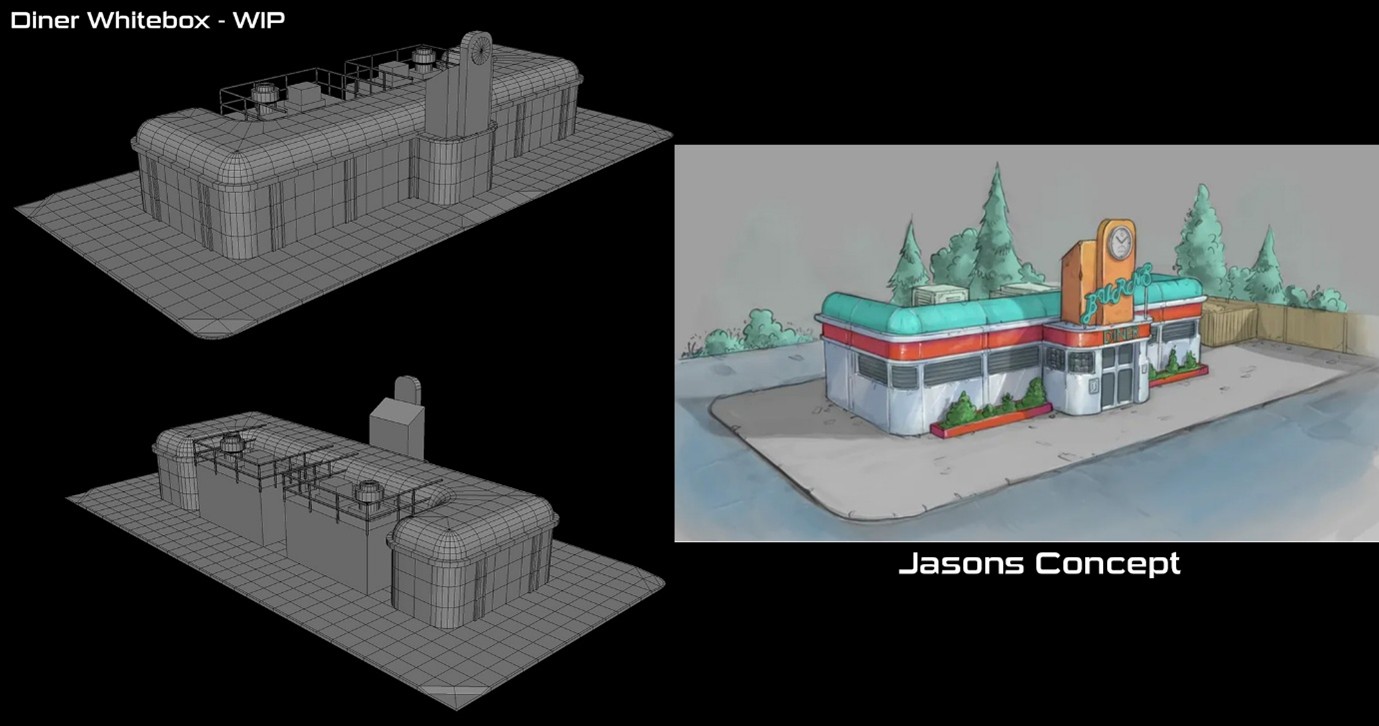 Once the concept art has been approved, the next step is to create the blockout image. At this stage everything is simple and the artist creates a non-detailed 3D version of the diner using basic geometric shapes. At this stage, the diner will have no textures or any small details added. The goal for this is to test that the scale and proportions are right inside the engine.