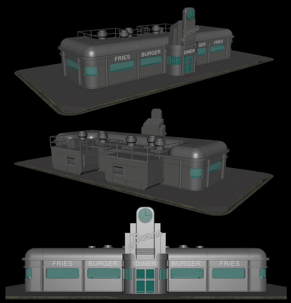 The next step, once the team are happy with the diner’s basic shape is to move onto modelling the details. This includes adding details such as windows, doors, roof, signage and other exterior design.