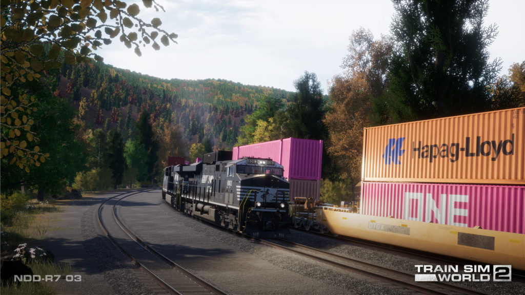 Take control of either of the NS GP38-2’s or NS ES44AC’s, make sure you maintain your speed while descending some steep gradients. Drive across the many different features of the route such as: